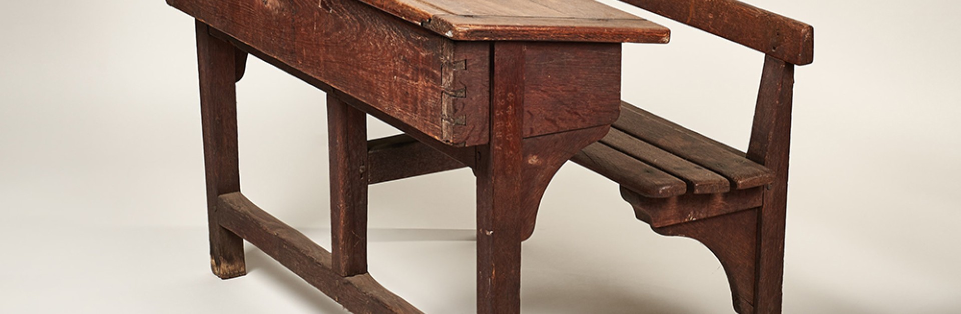 L’idée de tables confortables, commodes et maniables remonte aux années 1890. Pourtant, on a longtemps utilisé ces pupitres à 2, 4, 6, 8 places, héritées du XIXème siècle, au banc sans dossier lié à la table. C’est l’enfant qui doit s’adapter à la table et non l’inverse. Vers 1950, la table à deux places est généralisée. Ce n’est que vers les années 1960, grâce à la fabrication en grande série, que le mobilier à tubes d’acier va se propager dans les écoles. Un orifice était aménagé dans ces tables qui accueillait un petit encrier en faïence dans lequel les enfants trempaient leurs plumes Sergent-Major.